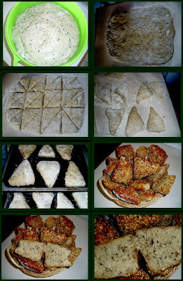 Pentru ultima dospire, trigoanele se aseaza cu semintele in jos pt. 60 min.Dupa care se aseaza pe tava de copt cu semintele deasupra si se coc la 240°C. cu mult abur.